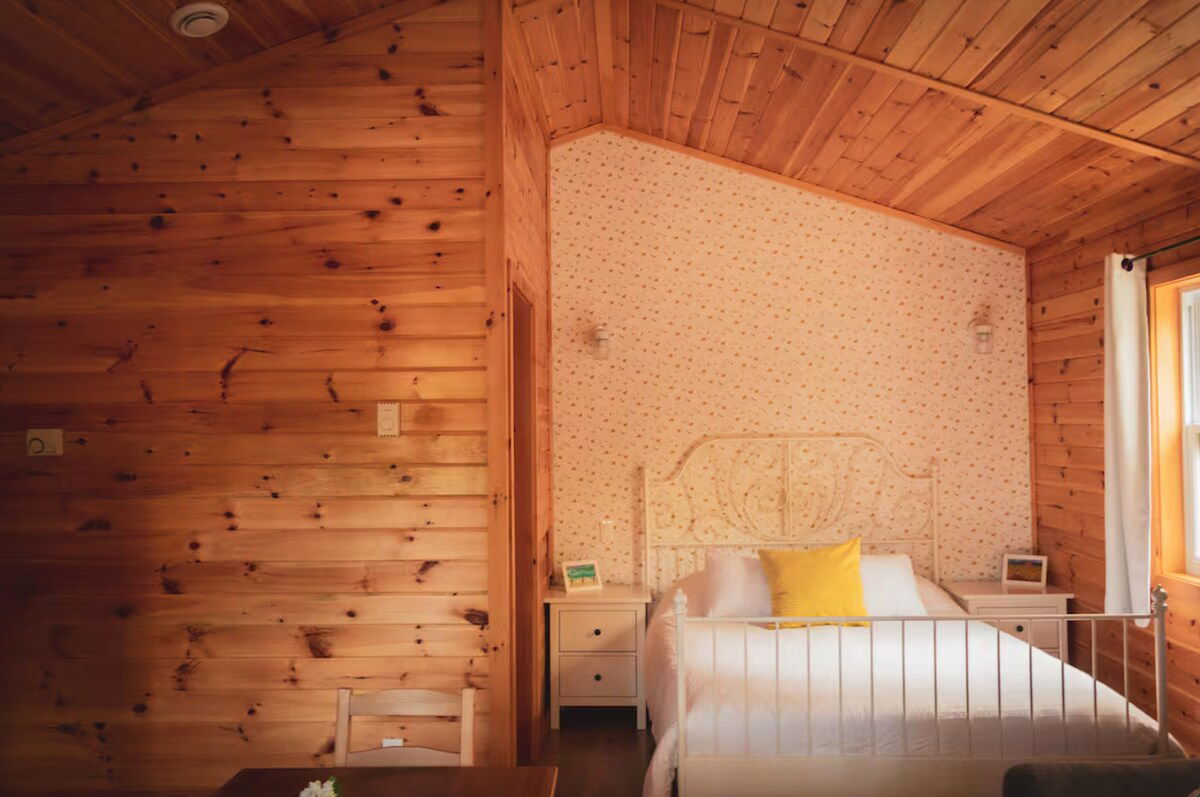 The Maple Cottage at Lawrencetown Lodge is one of five private, luxury-focused cottages set in nature. This cozy 320 sq. ft. open-concept retreat sits on its own peaceful oasis and features playful yellow accents, including a floral wallpaper feature wall. Fully equipped with a queen bed, full kitchen and bath, dining area, private fire pit, BBQ with propane, and a wood-fired hot tub with a starter tote of firewood.